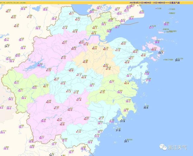 6:00截至1,温38-41℃我省大部最高气,云和42.4℃、丽水42.2℃ 最高前三甲 :青田42.7℃、。站点≥42℃总共有4个,点≥41℃19个站,点≥40℃44个站。