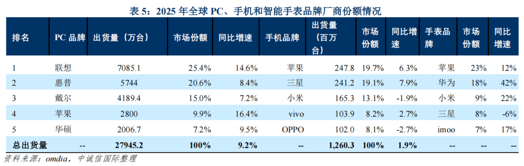 方面PC,mdia遵照O,货量到达2.795亿台2025年环球PC出,9.2%同比增进;中其,C出货量到达4估计中国大陆P,0万台15,长5%同比增亚星来看实在,大型国企及工作单元等对商用PC的采购需求信创生态系统修筑及国产代替加快拉动当局、,增进的要紧动力成为PC需求,需求相对稳定而幼我PC。为、戴尔等头部品牌主导供应需要端则照旧出现为联念、华,货周期有所延迟信创类产物备,0 SSD等代价于年中先导猛增DDR5内存、PCIe 4.,性欠缺推高本钱主旨组件阶段,端产物均价上涨进而传导至终,C代价战激烈而初学级P,剩余空间压低厂商,分裂明显行业代价。以为咱们,代价上涨及供货紧缺影响2026年受主旨部件,造压力进一步增大PC厂商的本钱控,将有所调理出货战略,供需希望进一步增进信创与AI联系产物,效应边际递减叠加终端产物面对涨价压力但跟着以旧换新战略对消费类PC拉动,C需求或将走弱估计消费类P,行业出现趋稳估计PC整个。