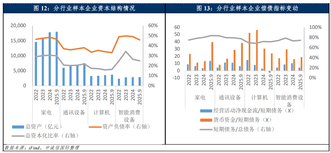 景况来看从债务,5年9月末截至202,业债务范围为7电子配置样本企,87亿元149.,.70%增速0;别为39.50%和22.78%均匀资产欠债率和总本钱化比率分,分点和2.64个百分点诀别同比扩大0.3个百,来看总体,财政杠杆秤谌相对安宁样本企业债务范围及,务率较低本质债。此中但,总本钱化比率相对较其他子行业略高家电和智能消费配置行业样本企业。机合来看从债务,期末同,升1.31个百分点至77.40%电子配置样本企业短期债务占比上,务占比高达83.81%此中家电样本企业短期债,债务占比偏高行业整个短期,正在优化空间限期机合存。
