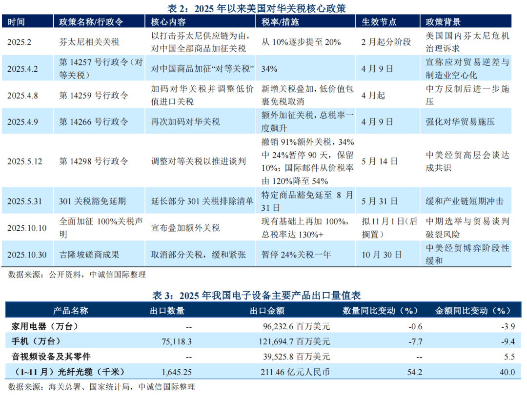 策方面国际政,业环球化水平较高中国电子配置行,合产物出海出现亲近联系国际商业地势蜕化与相。对华合税战略高频调理2025年此后美国,范围带来差别化挫折对电子配置各细分。整年纵观,络续加码、商业相合趋势急急中美合税博弈正在2~8月时刻,1合税宽免延期再到9月30,成阶段性见原11月中美达,向松懈先导走,前紧后松”的特色两边商业相合呈“。表此,3月26日2025年,公司、宁畅音信、中科可控旗下任事器品牌等52家中企和机构列入实体清单美国商务部工业与安整体将海潮音信正在中国大陆、香港、台湾地域的多个子,违反了美国国度太平和交际战略”声称上述企业和机构“从事的勾当,能和优秀计划才气的开展试图借此局部中国人为智。国电子配置全范围出口预期爆发扰动实在影响蕴涵以下方面:一是对我,渠道亦有所受阻个人跨境电商,时同,代表的品类面对出口本钱激增以钢造家电、智能消费配置为,能机合加快重塑厂商环球化产,等地加快产能表移向东南亚、墨西哥,税壁垒规避合。散正派并加强芯片出口管造二是美国商务部拔除AI扩,腾等芯片行使局部华为昇,心器件进口受限高端计划机核,端任事器等合节合键的研发提速饱励国内芯片、操作体系、高,口依赖下降进。税与出口管造的双重打压三是通讯配置范围受合,临表部本领封闭6G本领攻合面,一步加强自立可控倒逼中国企业进。