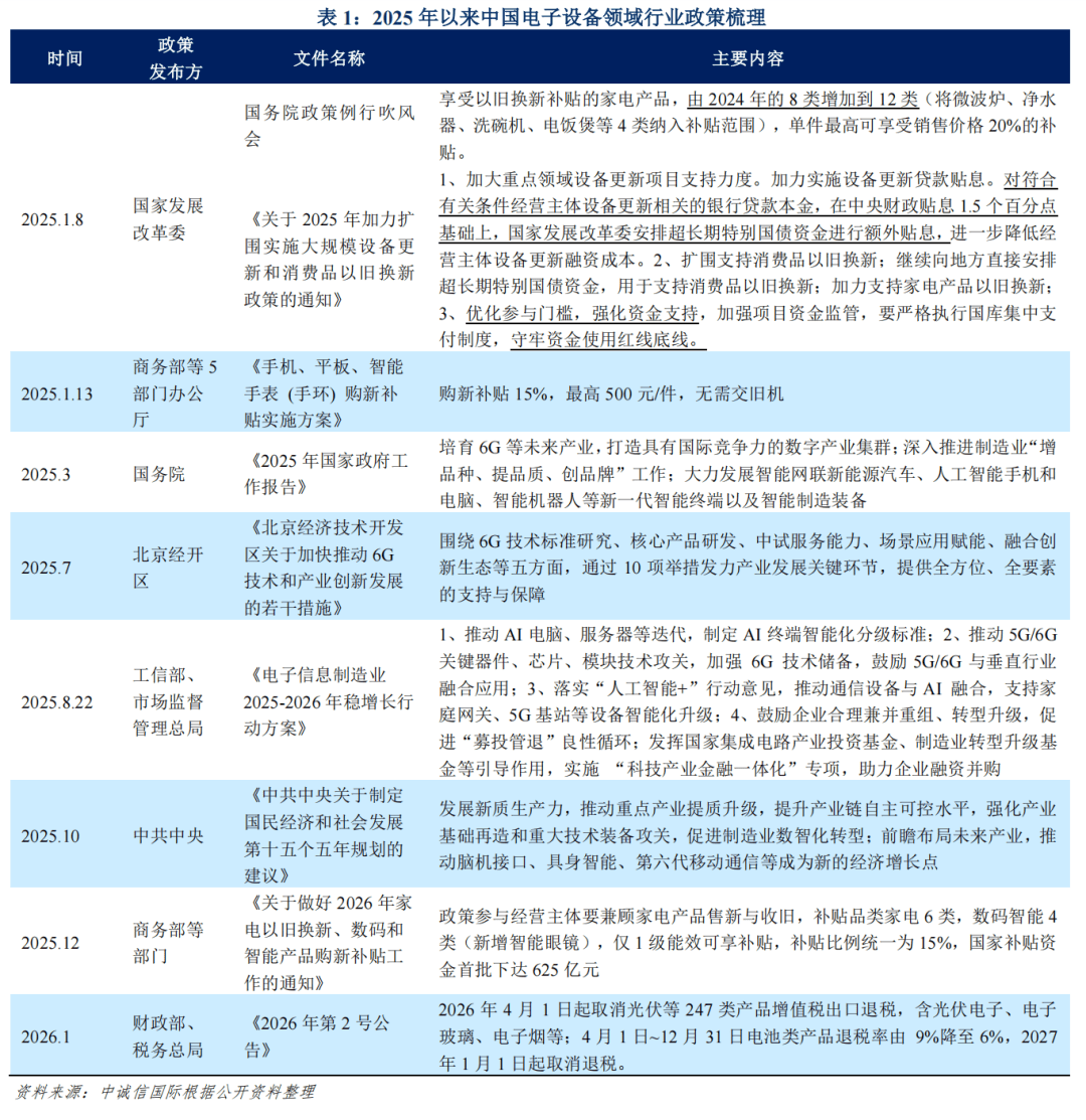 策方面国内政,5年此后202,振、本领更始、财富绿色化与智能化开展、调机合我国盘绕电子配置行业的联系战略要紧聚焦消费提。来看实在,能消费配置国内需求的开释起到了较大的主动影响加力扩围的以旧换新战略对付家电、计划机和智,财富能效升级进一步饱励。果来看从效,旧换新超1.29亿件2025年中国度电以,产物购新超9手机等数码,0万部10,出售额超2.6万亿元以旧换新带头联系商品,.6亿人次惠及超3;案》、《2025年国度当局就业申报》等战略的颁布《电辅音信创设业2025-2026年稳增进活动方,升、以6G本领为代表的新一代通讯本领攻合与本领储存等方面临于饱励AI寻常操纵、电子配置迭代、合节器件国产化率提,策牵引与倾向指引供给了强有力的政。6年1月202,务总局通告称财务部和税,焦光伏、电池、显示质料等产能过剩及低价逐鹿范围自2026年4月1日起取缔出口退税的电子产物聚,内卷表化”旨正在抑低“,术与品牌升级领导财富向技,产能构造加快海表。