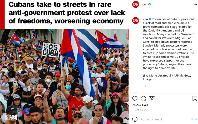 如比,am上宣布了一则合于古巴人“抗议”当局的贴文美国CNN昨天正在境表社交平台Instagr,巴抗议者走上陌头称成千上万的古,济危急及其所激发的食品和药品欠缺抗议因疫情和美国经济封闭导致的经,迪亚斯-卡内尔下台还央求古巴国度主席。