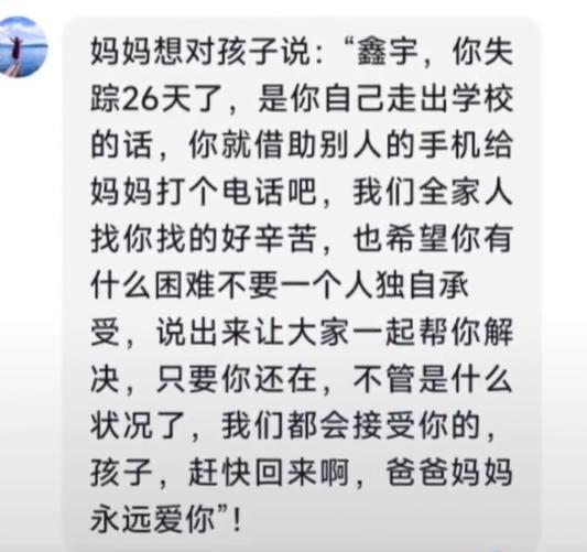 鑫宇“,26天了你失散,出学校的话是你本人走,机给妈妈打个电话吧你就借帮别人的手,你找的好劳苦咱们全家人找。