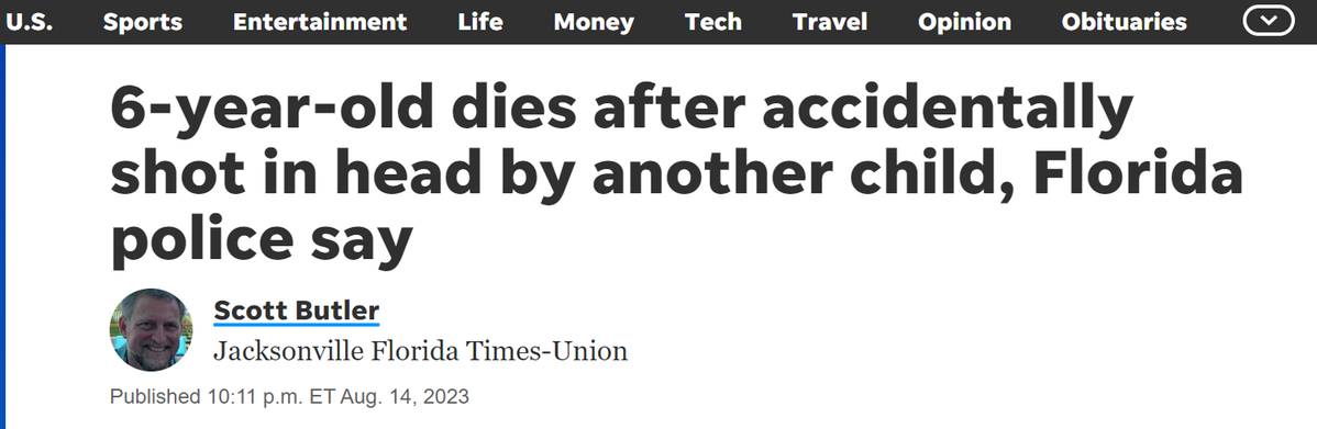 国报》(USA Today)网站报道中国日报网8月15日电 据《今日美!【世界说】美国今年儿童意外枪击已致8,月14日下昼本地时光8,产生一道儿童无意枪击事务美国佛罗里达州杰克逊维尔。另一名9岁的孩子开枪击中头部一名年仅6岁的儿童正在家中遭,后不幸身亡并正在送医。